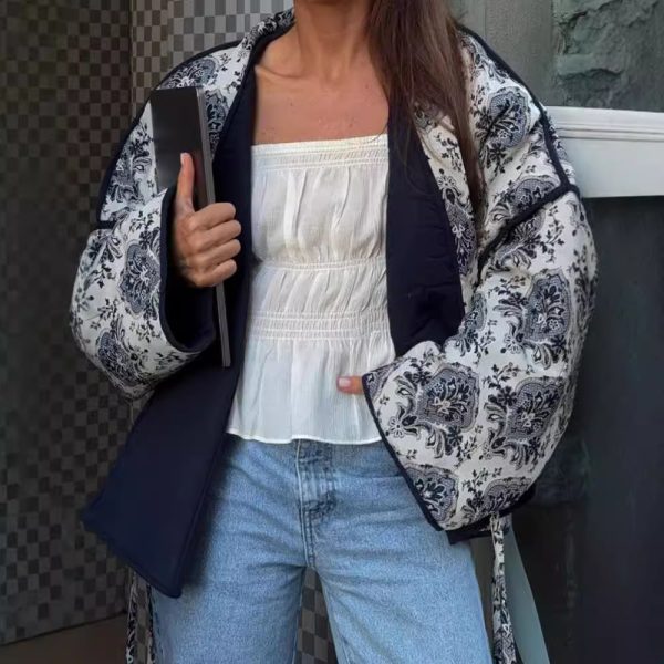 Casual printed long-sleeved cotton coat with tie