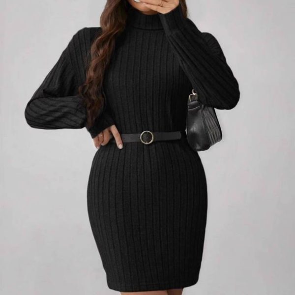 Ribbed fleece turtleneck slim-fit dress, bodycon skirt