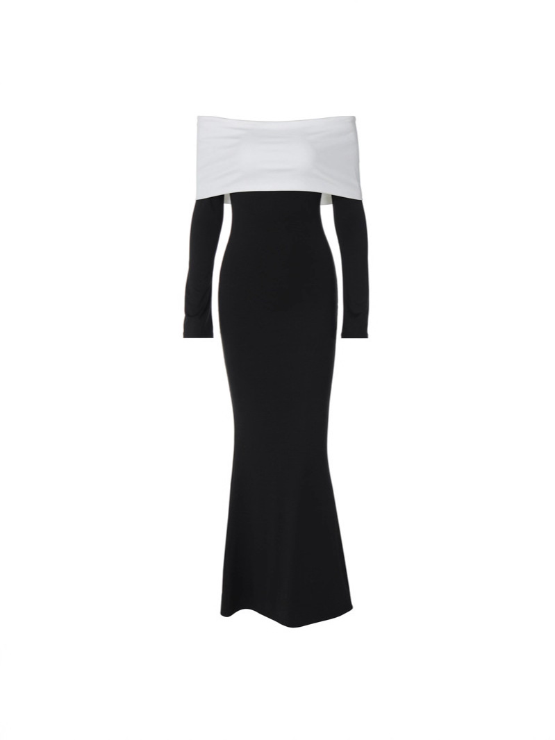 Sleek Sophistication, Reimagined. Embrace the cooler seasons with our Black and White Color-Blocked Off-Shoulder Dress – a modern classic designed to turn heads. This isn’t just a dress; it’s a statement.